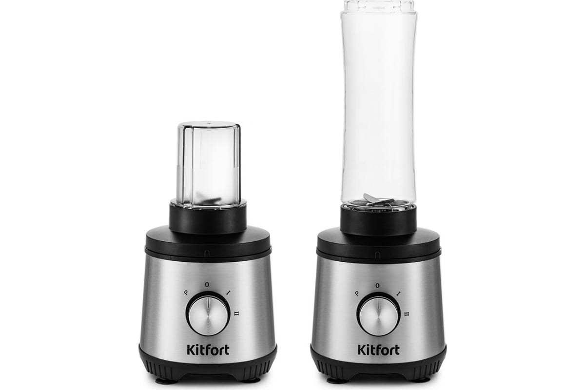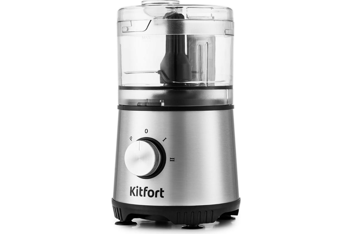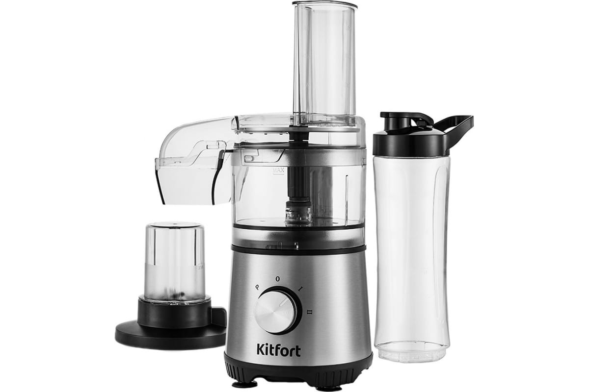 Кухонный комбайн KITFORT 4 в 1 мощность 400 Вт длина шнура 1,2 м КТ-1386 выполняет функции блендера, измельчителя, тёрки/шинковки и кофемолки. Измельчитель позволит измельчить мясо, твёрдый сыр, овощи, травы, чеснок, ягоды. Тёрка легко справится с шинковкой овощей, фруктов и других продуктов.Блендер позволит приготовить протеиновые смеси и фитнес-напитки, а также смешать жидкое тесто. Кофемолка с лёгкостью справится с кофейными зёрнами, специями и орехами.В комплекте с кухонным комбайном идёт портативная бутылка объёмом 600 мл. После приготовления напитка бутылку можно закрыть навинчивающейся крышкой, после чего она превращается в удобный контейнер для хранения и переноски приготовленной смеси.У комбайна 3 режима работы: 2 скорости и импульсный режим, который можно использовать для колки льда. Нужный режим работы легко устанавливается поворотом ручки скорости.Все ножи, которые идут в комплекте с кухонным комбайном, выполнены из нержавеющей стали. Каждый набор ножей имеет оптимальную форму и степень остроты лезвий, исходя из конкретных задач.Для обеспечения безопасности комбайн может работать только с установленной чашей.Резиновые ножки обеспечивают прочную фиксацию прибора на столе. Все элементы кухонного комбайна легко разбираются и моются.