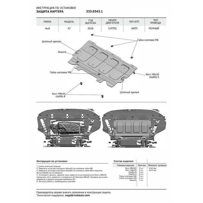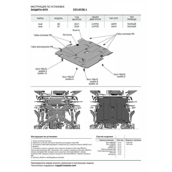 Защита картера и КПП Rival для A7 (V - 3.0 340л.с.) 2018-н.в., алюминий 4 мм, с крепежом, K333.0338.1