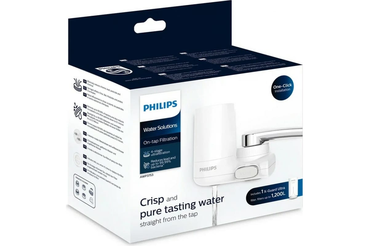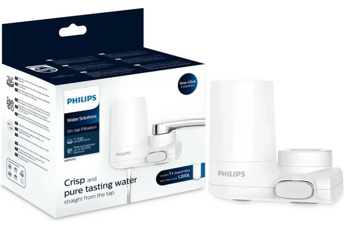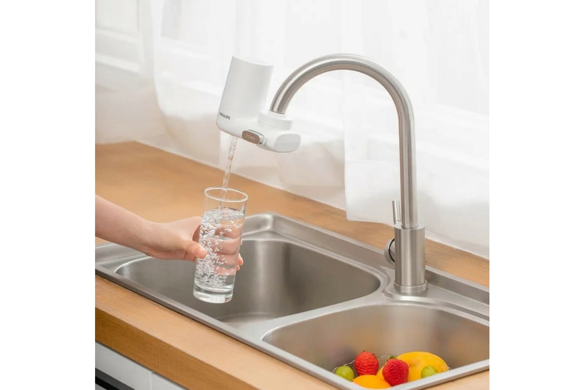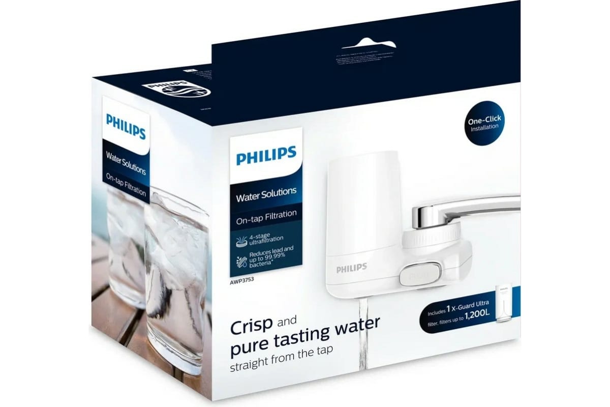 Насадка на кран PHILIPS AWP3753/10 уменьшает количество бактерий, хлора, тяжелых металлов, химикатов, пестицидов, летучих органических соединений и микропластика, очищает воду, придавая ей лучший вкус.