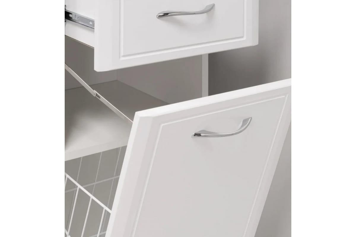 Изделие имеет две распашные дверцы и выдвижной ящик на шариковых направляющих посередине. В верхнем отделении - одна распашная дверца с внутренней полкой, в нижнем - одна откидная дверца с полкой и корзиной для белья.