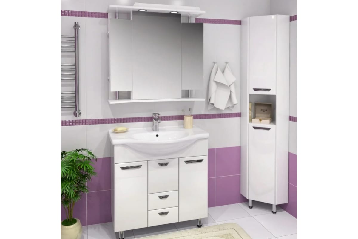 Шкаф выполнен в белом цвете, идеально впишется в любой интерьер ванной комнаты.