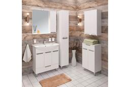 Шкафчик выполнен в стильном дизайне с врезными ручками. Имеет две распашные дверцы, в нижнем и верхнем отделениях по две встроенные полки. Цвет фасада универсальный - белый, идеально впишется в любой интерьер ванной комнаты.
