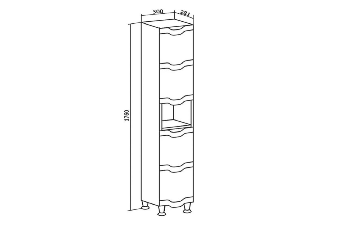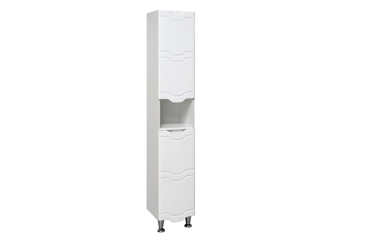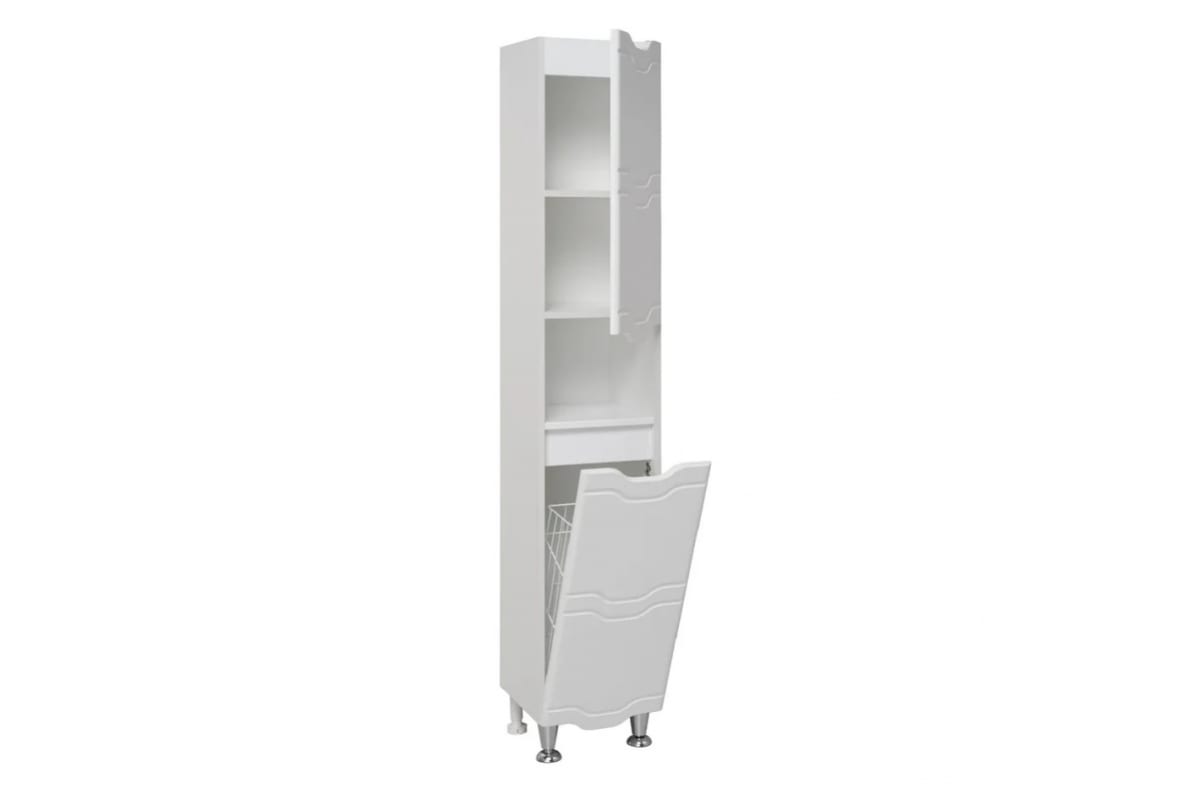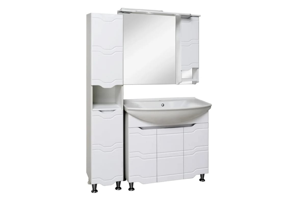 Шкаф выполнен в традиционном белом цвете с волнистой фрезеровкой по фасаду, гармонично впишется в любой интерьер ванной комнаты.