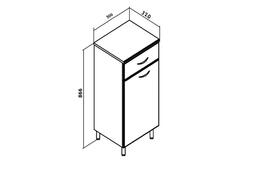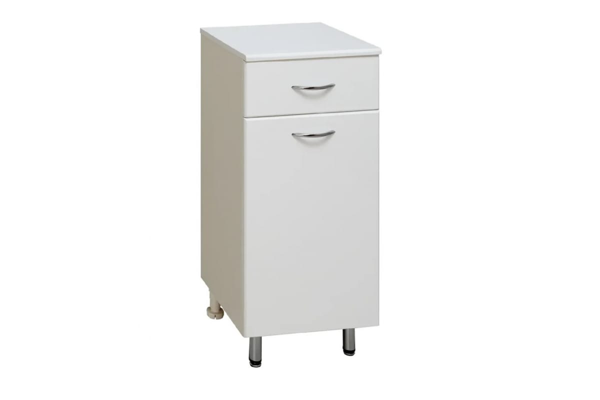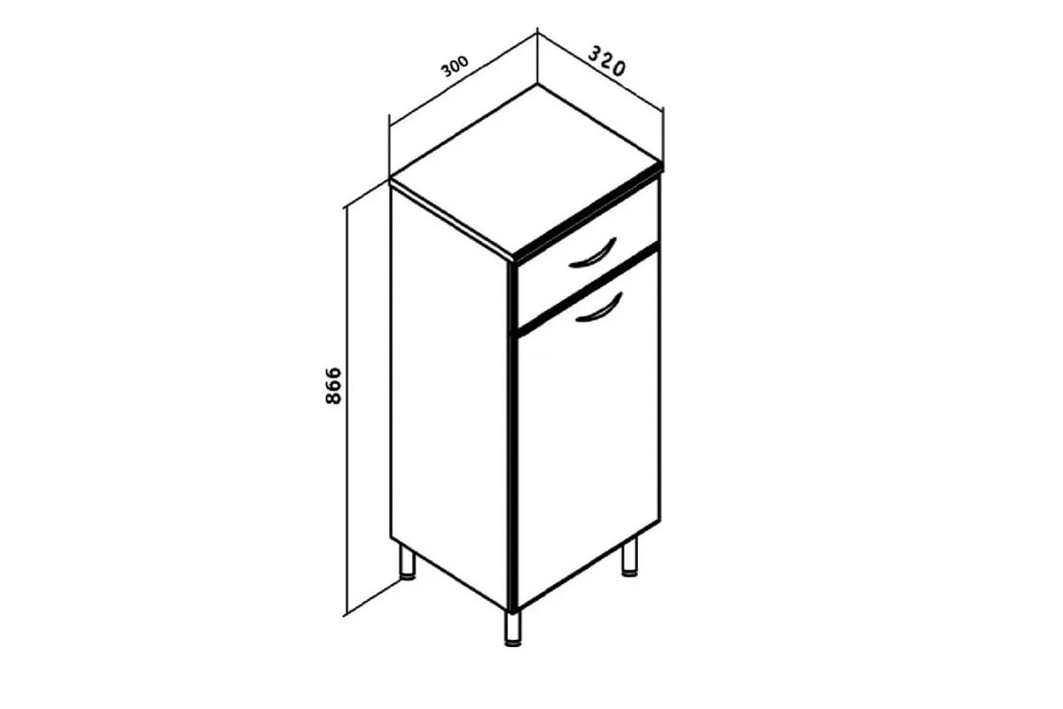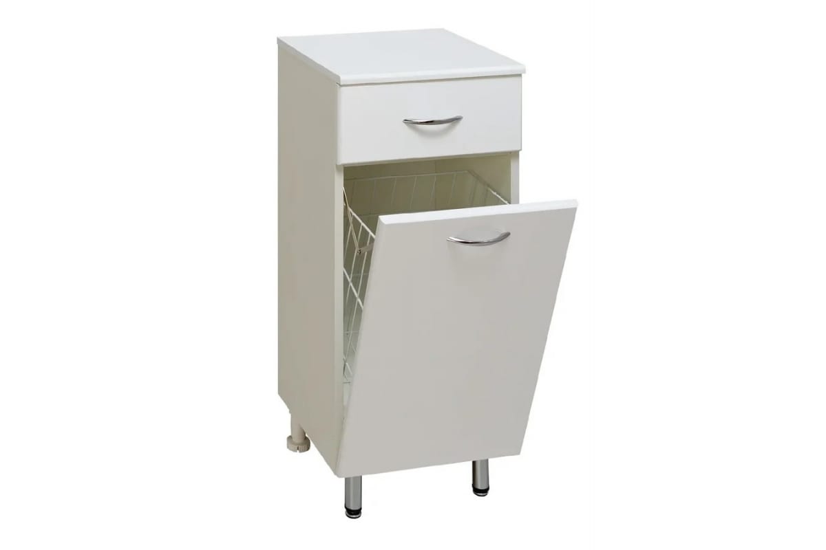 Тумба имеет одну откидную дверцу и один выдвижной ящик на шариковых направляющих. В нижнем отделении одна внутренняя полка и корзина для белья.