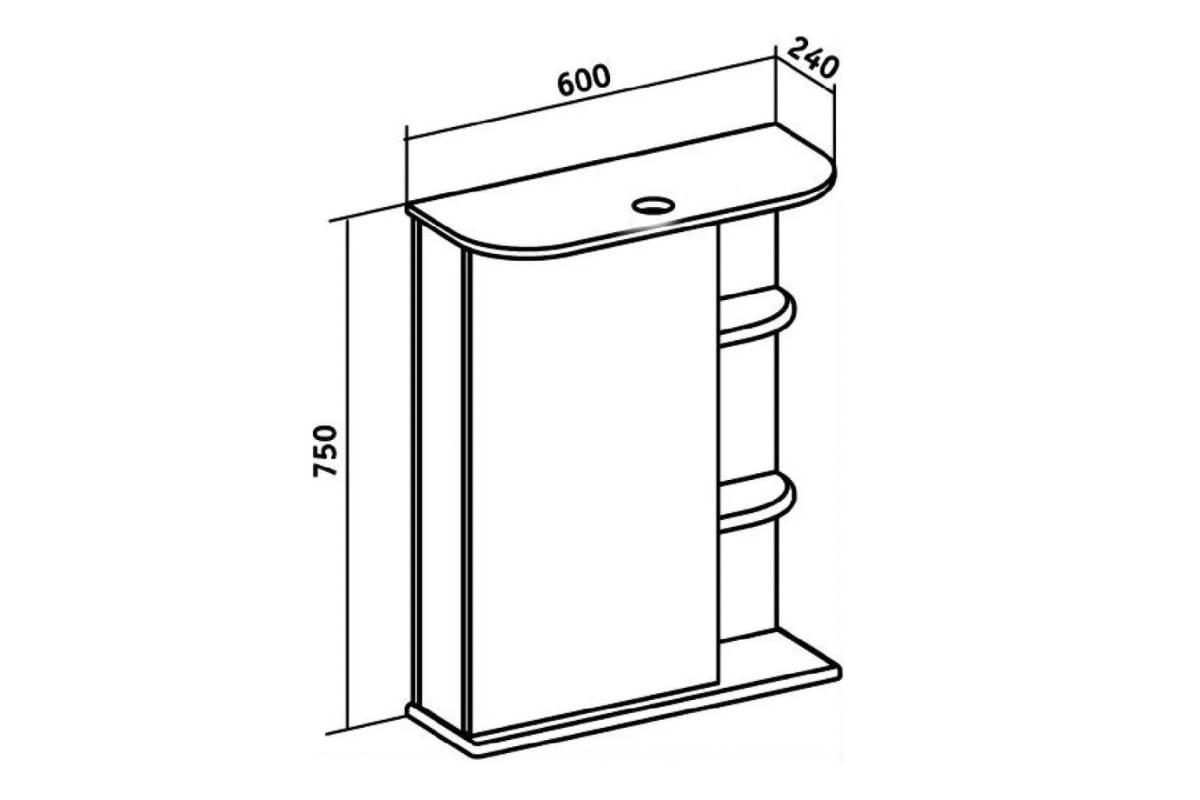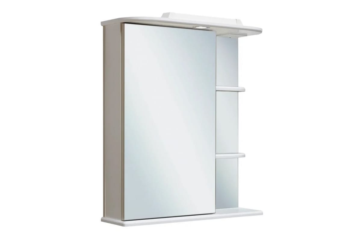 Зеркальный шкаф RUNO Магнолия 60 левый 00000000030 имеет одну распашную дверцу с зеркальным фасадом слева, две открытые полки справа.