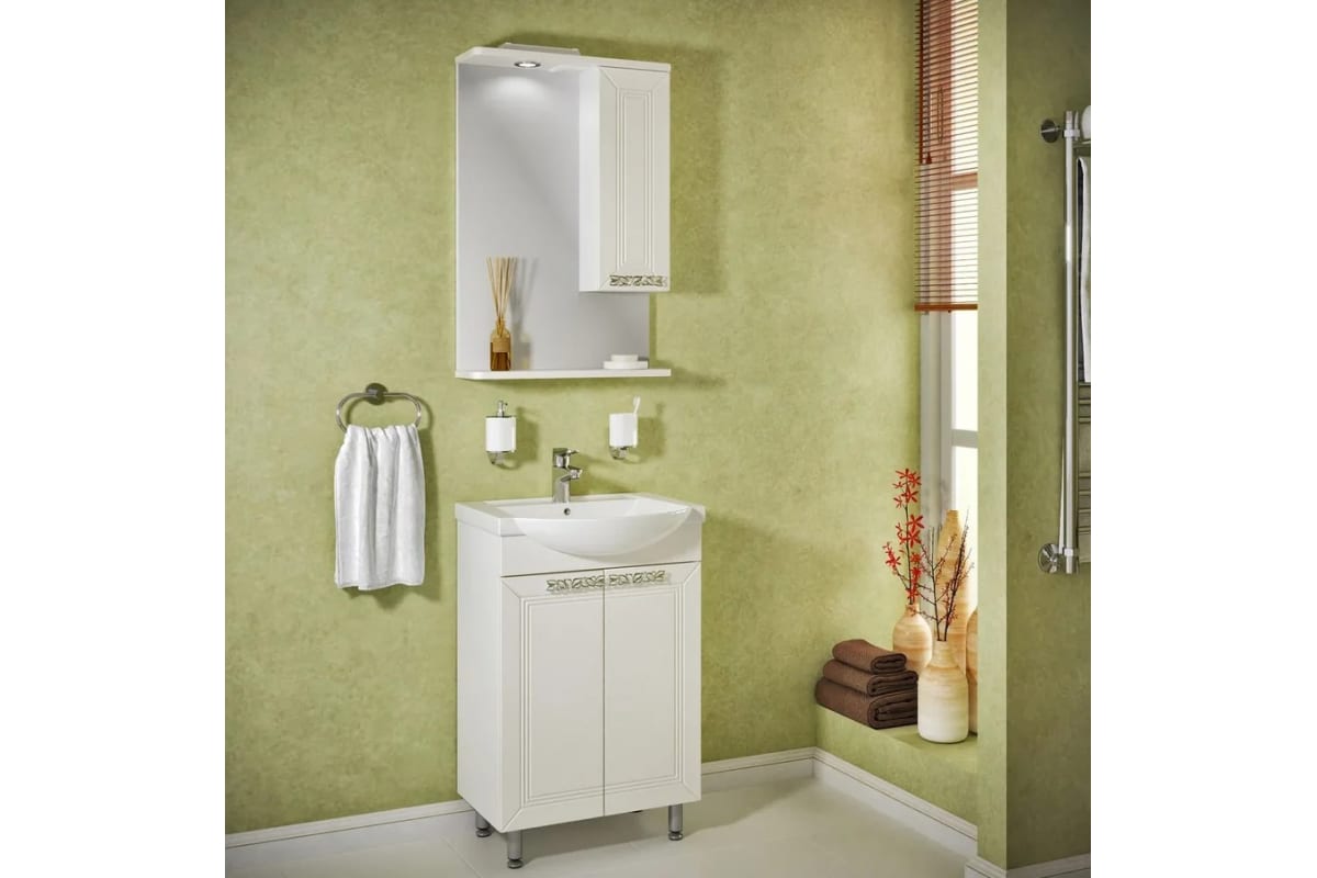 Зеркало настенное со шкафчиком и полкой RUNO МОНРО - современный изящный дизайн мебели для ванной в классическом белом цвете. Стильная фрезеровка и оригинальные ручки придают изделию утонченность и шик. Зеркало для ванной со шкафчиком МОНРО представляет собой зеркало настенное (слева) и шкаф в ванную с одной дверцей (справа). В шкафу имеется одна внутренняя полка. Шкаф для ванной оборудован одним врезным светодиодным светильником 220В и розеткой с выключателем. Зеркало шкаф для ванной комплектуется петлями со встроенным доводчиком и ручкой. Мебель для ванной RUNO - красота и практичность в мелочах!