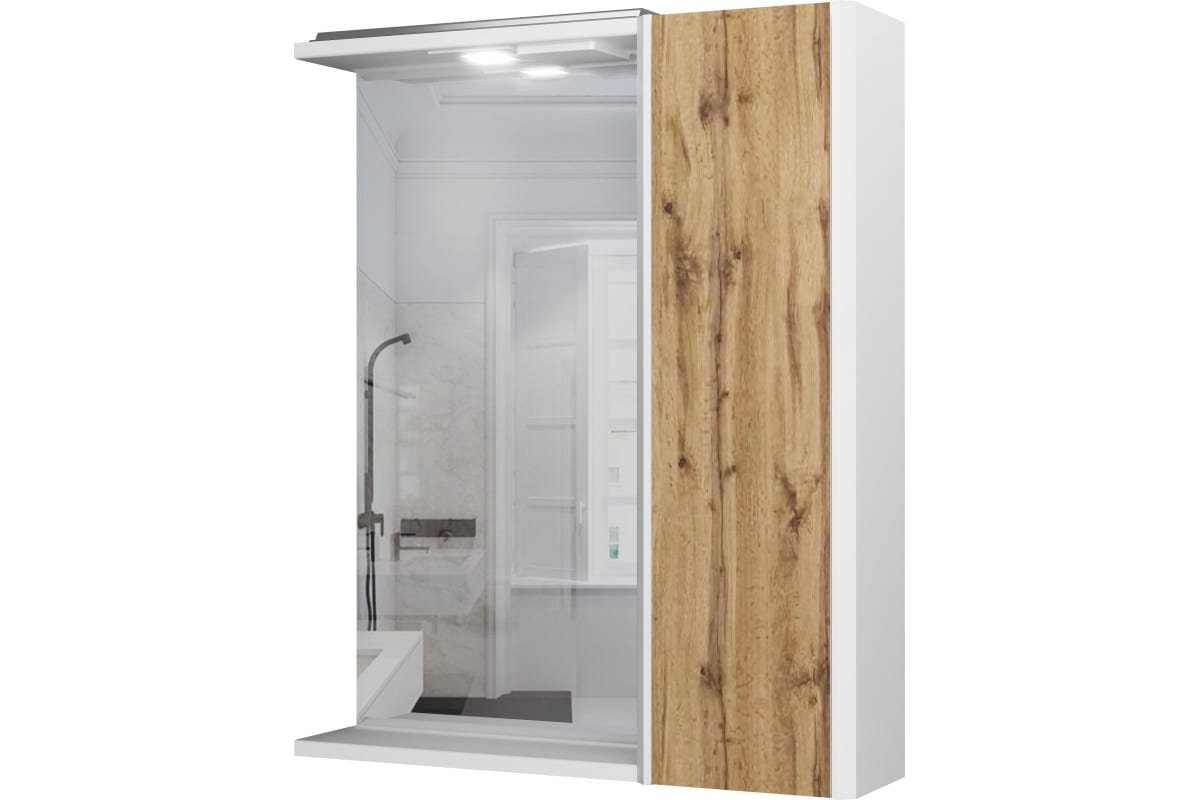 Шкаф-зеркало Домино Uno 60 Дуб Вотан, правый DU1510HZ отражает современные тенденции в дизайне мебели для ванных комнат. Четкие геометрические формы и сочетания древесной текстуры с белым глянцем позволяет создать стильные и функциональные интерьеры.