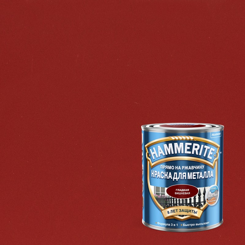 Краска для металла HAMMERITE гладкая 2,5л вишневая защищает поверхность до 8 лет, образует атмосферостойкое эластичное, нерастрескивающееся покрытие с грязе- и водоотталкивающими свойствами, устойчиво к воздействию бытовых химикатов и кратковременному воздействию моторного топлива и маселОБЛАСТЬ ПРИМЕНЕНИЯ: внутренние и наружные работыТЕМПЕРАТУРА НАНЕСЕНИЯ: +5 С° до +30 С°ВРЕМЯ ВЫСЫХАНИЯ: 4 часаПОВТОРНОЕ НАНЕСЕНИЕ: через 4 - 6 часовСПОСОБ НАНЕСЕНИЯ: валик; кисть; краскопультРАСХОД: 1 л на 10 м² в 1 слойТЕРМОСТОЙКОСТЬ ПОКРЫТИЯ: от -20 С° до +80 С°РАЗБАВЛЕНИЕ: Растворителем и Очистителем Hammerite, при работе кистью – не требуется, при работе валиком – для первого слоя разбавить не более 1:10 ( 1 часть растворителя к 10 частям краски Хаммерайт);ОСОБЕННОСТИ ПРИМЕНЕНИЯ: для поверхностей черного металла, цветного металла, дерева, твердых видов пластика• на ржавые металлические поверхности необходимо отшлифовать поверхность, используя грубую наждачную бумагу;• на металлические поверхности без покрытия необходимо обезжирить поверхность Очистителем и растворителем Hammerite;• на ранее окрашенные металлические поверхности отшлифуйте окрашенную поверхность с целью удаления неплотно держащегося покрытие, блеска старого покрытия, очищения от загрязнений. Тщательно промойте поверхность раствором чистящего средства, смойте раствор чистой водой. Дождитесь высыхания поверхности. Проверьте совместимость с исходной краской. При наличии несовместимости она будет очевидна в течение часа после нанесения;• на блестящие и гладкие металлические поверхности необходимо дополнительное шлифование, обезжирьте поверхность очистителем и растворителем Hammerite. При необходимости улучшить сцепление краски с поверхностью можно при помощи грунта Spesial Metals Primer.• на неокрашенные гальванизированные/алюминиевые поверхности цветных металлов необходимо воспользоваться для максимальной адгезии грунтом для алюминия, цветных металлов и сплавов Hammerite Spesial Metals Primer.• на пластмассу необходимо использовать грунт Hammerite Spesial Metals Primer для улучшениия адгезии между слоями. Hammerite можно окрашивать некоторые виды пластмассы используемые для изготовления канализационных и водосточных труб. Краску Hammerite нельзя использовать на поверхностях, находящихся в длительном контакте с водой, например на внутренней стороне труб.• на дерево используйте Hammerite Spesial Metals Primer для улучшения адгезии между слоями если это новая древесина; при окрашивании ранее окрашенной древесины необходимо отшлифовать поверхность, удалить блеск и загрязнения, тщательно промыть поверхность раствором чистящего средства, смыть чистой водой, дождаться высыхания поверхности