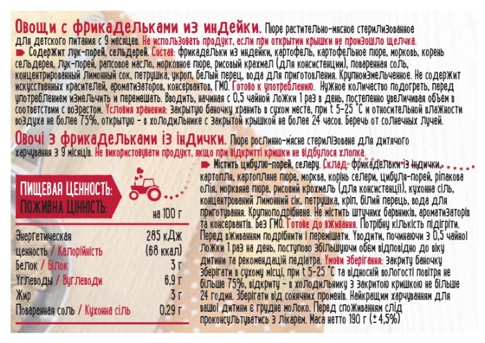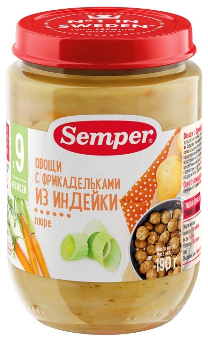- Состав фрикадельки из индейки, картофель, картофельное пюре, морковь, корень сельдерея, лук-порей, рапсовое масло, морковное пюре, рисовый крахмал, поваренная соль, концентрированный лимонный сок, петрушка, укроп, белый перец, вода