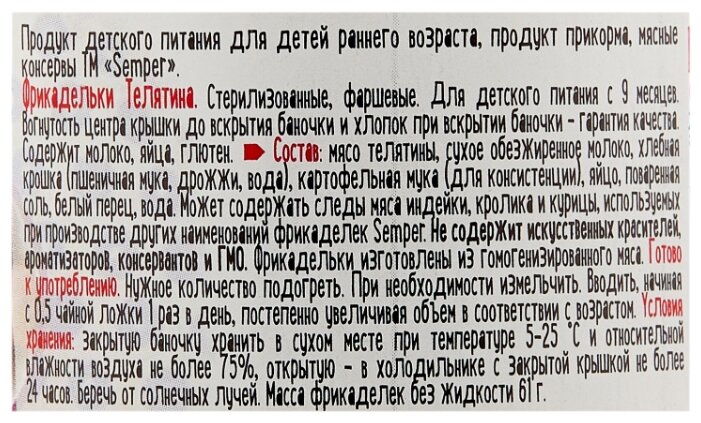 - Состав мясо телятины, обезжиренное сухое молоко, хлебные крошки (пшеничная мука, дрожжи, вода), картофельная мука, яйца, поваренная соль, белый перец, вода