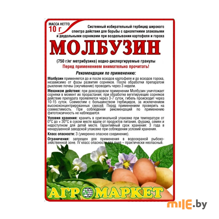 Гербицид Молбузин АГРОМАРКЕТ 10 г (16697) - это системный избирательный гербицид широкого спектра действия. Предназначен для борьбы с однолетними злаковыми и двудольными сорняками при возделывании картофеля и гороха. Применяется до и после всходов картофеля и до всходов гороха, независимо от фазы развития сорняков. После обработки препаратом рыхление почвы (окучивание) проводить через 3 недели.