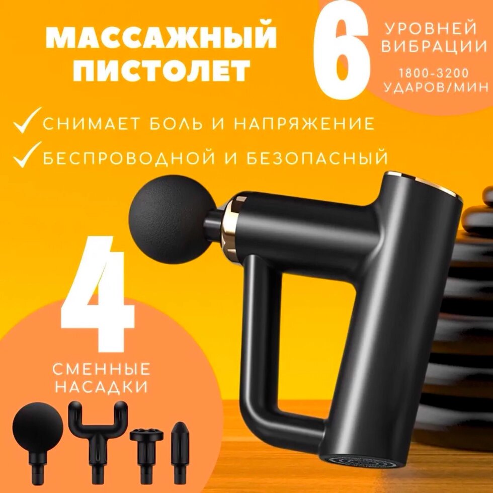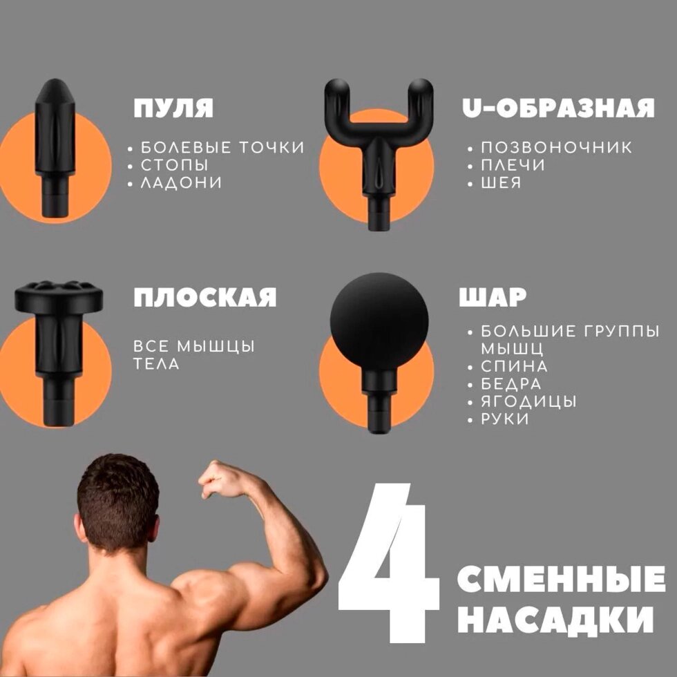 Перкуссионный мышечный массажер с 4 насадками (массажный ударный пистолет)