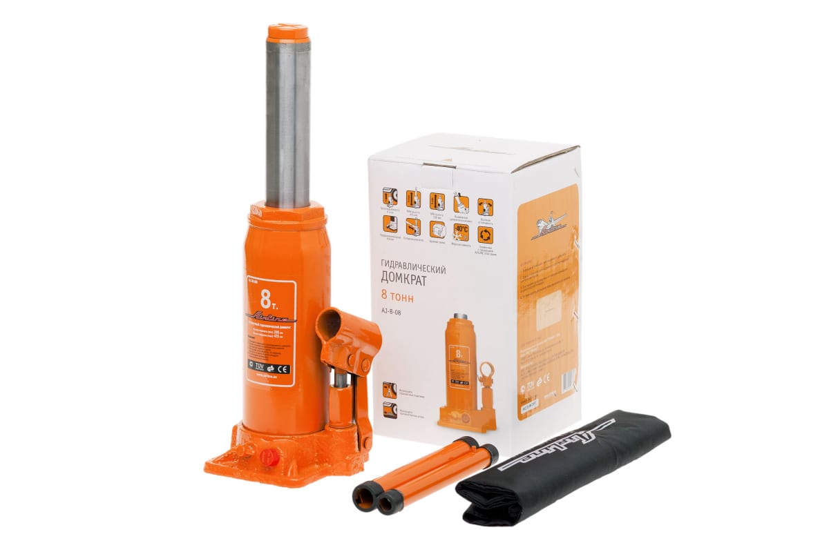 Бутылочный домкрат Airline 8 т, в сумке, 236-475 мм AJ-B-08 обладает простейшей схемой функционирования. Занимает мало места и не требует особых знаний в использовании. Единственное требование – хранение и транспортировка в вертикальном положении. Незаменим при необходимости поднять автомобиль массой до 8 т.