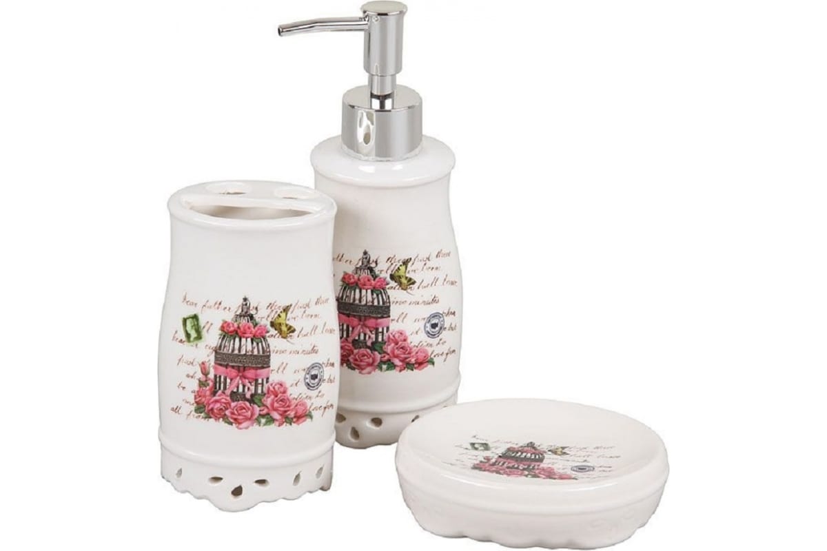 Набор для ванной комнаты из 3 предметов Rosenberg R-350106 включает в себя: дозатор для жидкого мыла 225 мл, подставку под зубные щетки и мыльницу. Набор выполнен из очень тонкой керамики с уникальным рисунком отлично впишется в интерьер любой ванной комнаты.