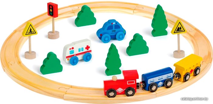 - Состав набора В наборе есть 8 деталей, из которых малышу предстоит собрать железнодорожный путь, а также поезд, состоящий из локомотива и 2-х вагонов, которые крепятся друг к другу с помощью магнитов, 2 машинки-скорая помощь и полиция, 5 деревьев и 3 дорожных знака.