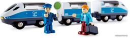 - Состав набора В комплекте есть три вагона, которые можно соединить с помощью встроенных магнитов или использовать отдельно друг от друга. Поставляются также фигурки пассажира и станционного работника, что обеспечивает высокую реалистичность игры.