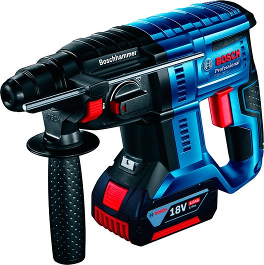 Питание: от аккумулятора, тип крепления сверла SDS-Plus, макс. число оборотов холостого хода 1800 об/мин, регулятор числа оборотов, реверс, кейс.