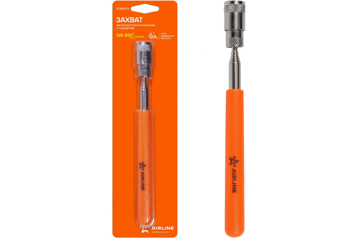 Магнитный захват AIRLINE телескопический, с подсветкой, 0,9 кгс, L=165-830 мм ATBS005 предназначен для подъёма мелких деталей и элементов крепежа из труднодоступных мест. Захват оснащен мощным магнитом для удобного захвата детали в четырех точках. Телескопическая конструкция поможет достать необходимый предмет даже в самых недоступных местах. Удобная рукоятка обеспечивает комфортную эксплуатацию. Подсветка захвата создает дополнительное удобство при использовании.