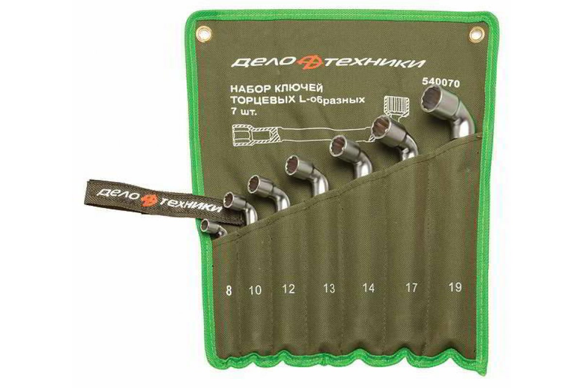 Набор торцовых сквозных L-образных ключей 7 шт сумка ДТ/20 Дело Техники 540070 изготовлен из хромванадиевой стали. Корпус имеет хромированное покрытие, которое защищает от возникновения коррозии. Все инструменты полностью закалены и полированы. L-образная форма обеспечивает большой крутящий момент. Тетроновая сумка используется для хранения и переноски ключей.