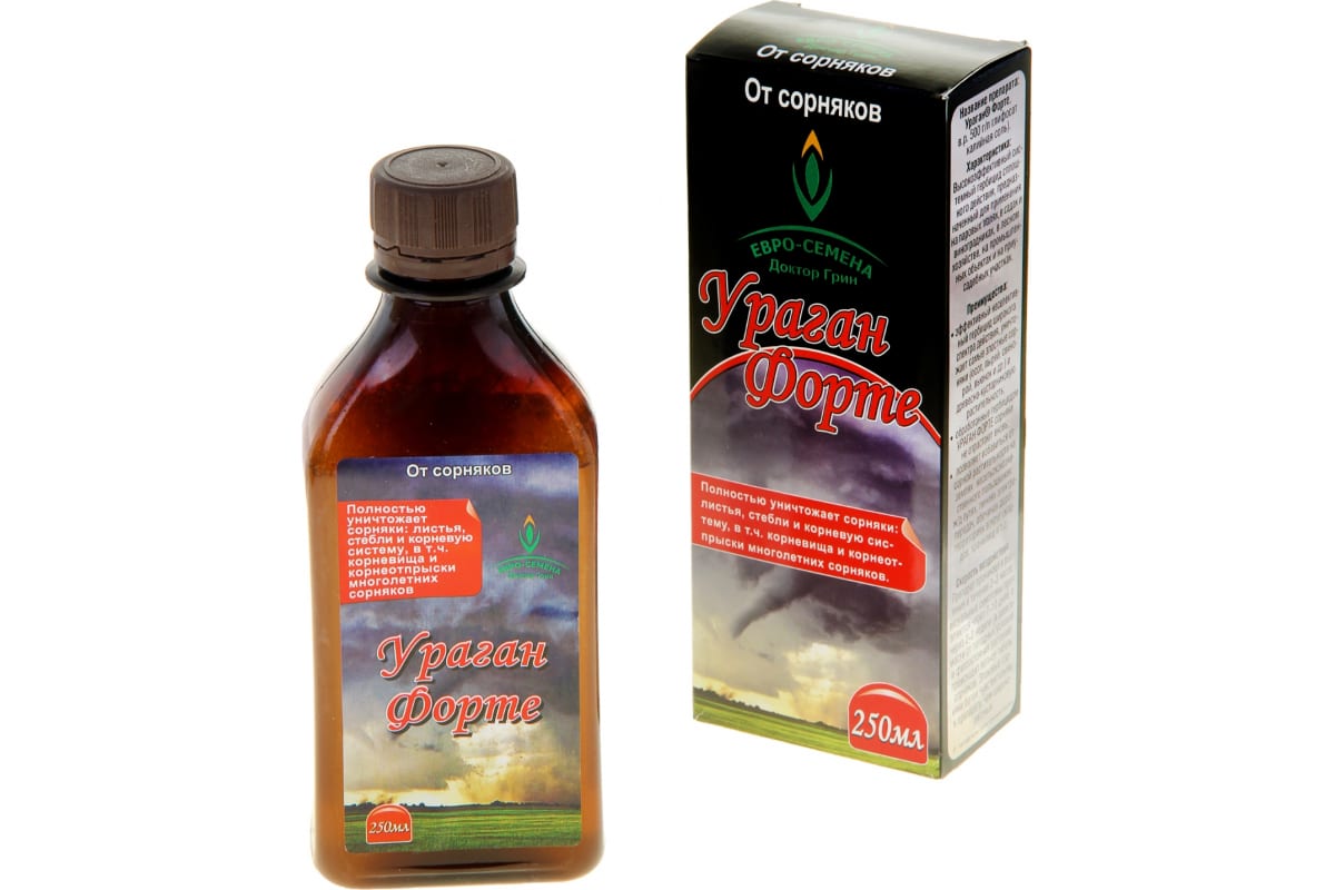 Средство от сорняков Доктор Грин Ураган Форте, 250мл 4690698004488 - гербицид сплошного действия. Эффективно устранит однолетние, и многолетние сорные растения. Не является селективным. Влияет на растение через листья и стебли, останавливая его жизнедеятельность в течение 2 часов. Через 2-3 недели сорняки гибнут полностью. Применение возможно с весны до поздней осени. Перед применением важно не косить и не полоть сорняки. После - не полоть в течение 7 дней.