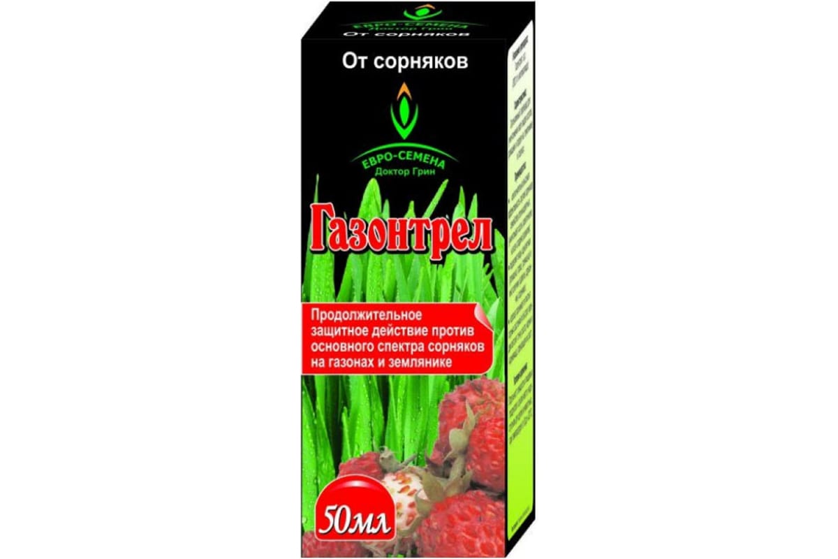 Средство от сорняков Доктор Грин Газонтрел, 50мл 4690698004440 - гербицид избирательного типа. Эффективно уничтожает сорняки семейства сложноцветных, однолетних, многолетних сорняков. Воздействует на сорняки через листья, достигая корня и прекращает их жизнедеятельность.