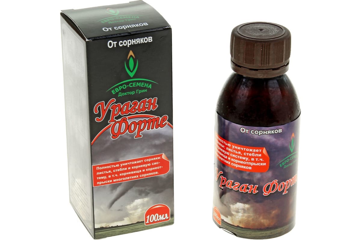 Средство от сорняков Доктор Грин Ураган Форте, 100мл 4610008690606 - гербицид сплошного действия. Эффективно устранит однолетние, и многолетние сорные растения. Не является селективным. Влияет на растение через листья и стебли, останавливая его жизнедеятельность в течение 2 часов. Через 2-3 недели сорняки гибнут полностью. Применение возможно с весны до поздней осени. Перед применением важно не косить и не полоть сорняки. После - не полоть в течение 7 дней.