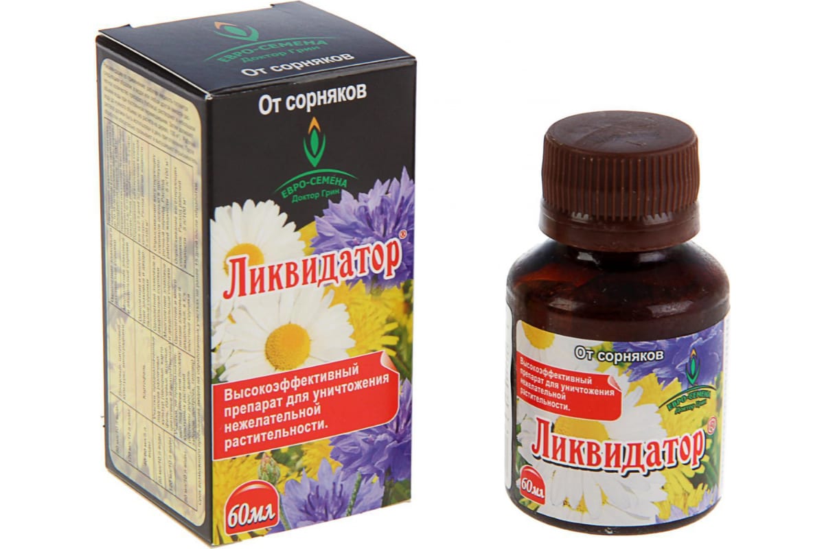 Средство от сорняков сплошного действия Доктор Грин Ликвидатор, 60 мл 4690698004457 - системный препарат сплошного действия для удаления нежелательной растительности, в том числе кустарников и деревьев. Применяют в сельском хозяйстве, на садовых участках, для приствольного удаления сорняков, а также на промышленных территориях, вдоль дорог и т.д. Применение препарата в период интенсивного роста сорняков, но до цветения помогает устранению с территории многолетних сорняков. Признаки воздействия Ликвидатора видны на 7 день. Через пару недель трава погибает полностью. Средство можно применять 1-2 раза за теплый сезон. Избавляет от сорняков на 2-3 месяца, предотвращает прорастание многолетних сорных растений.