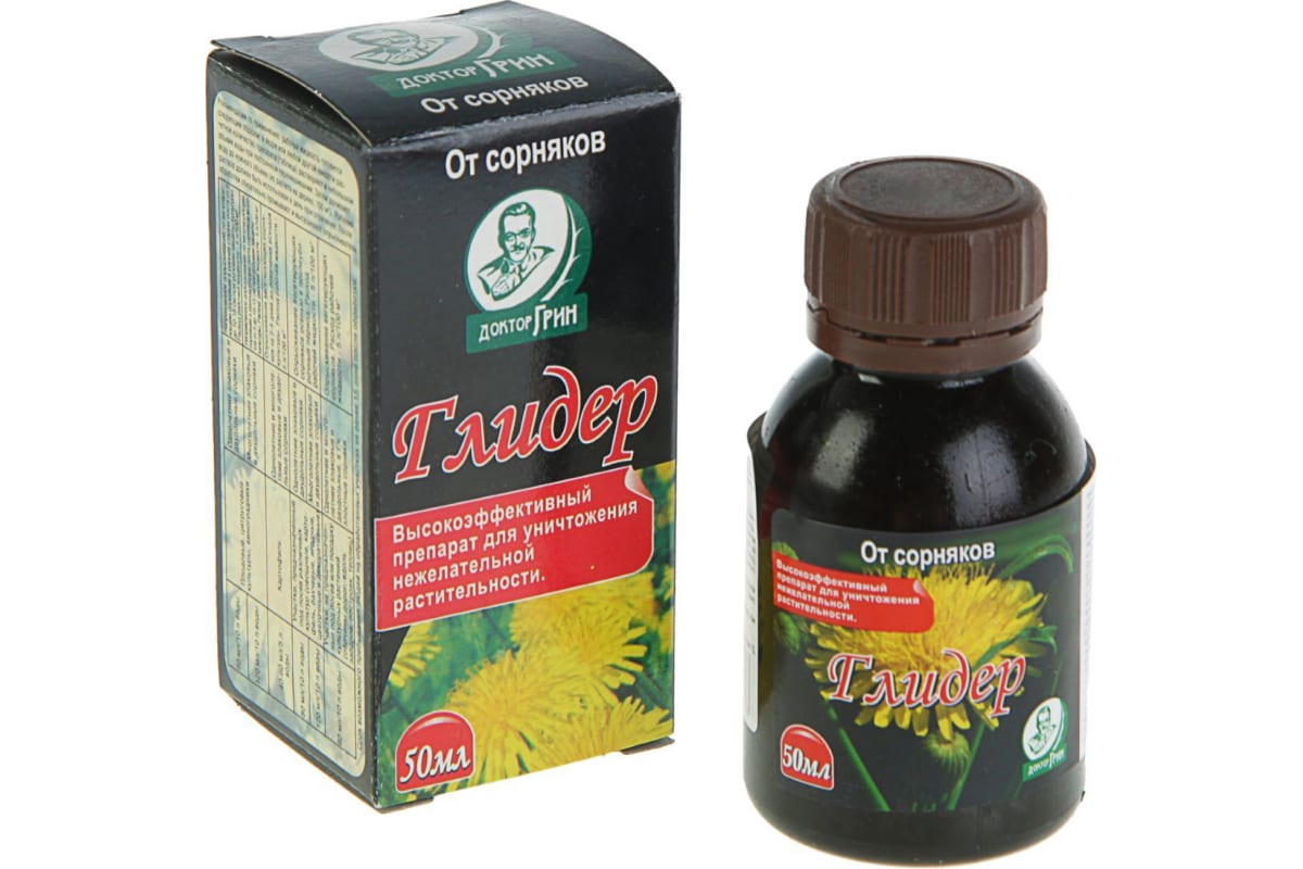 Средство от сорняков Доктор Грин Глидер, 50 мл 4610008690576 - системный препарат сплошного действия для удаления нежелательной растительности, в том числе кустарников и деревьев. Применяют в сельском хозяйстве и на садовых участках. Препарат передвигается по растению и достигает корня. Сорняки гибнут на 3-5 день. Через пару недель трава погибает полностью. Одно из преимуществ препарата - возможность использовать его совместно с удобрениями. Препарат предотвращает прорастание многолетних сорных растений.