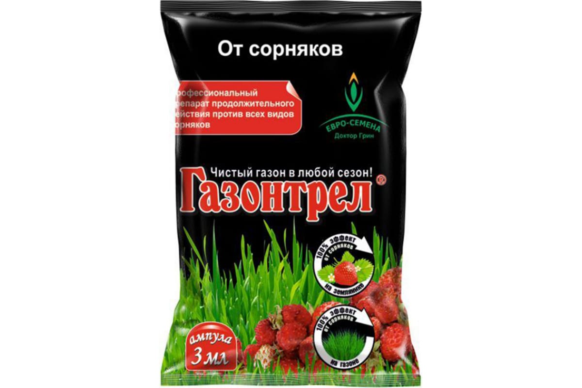 Средство от сорняков Доктор Грин Газонтрел, ампула 3мл 4690698014456 - гербицид избирательного типа. Эффективно уничтожает сорняки семейства сложноцветных, однолетних, многолетних сорняков. Воздействует на сорняки через листья, достигая корня и прекращает их жизнедеятельность.