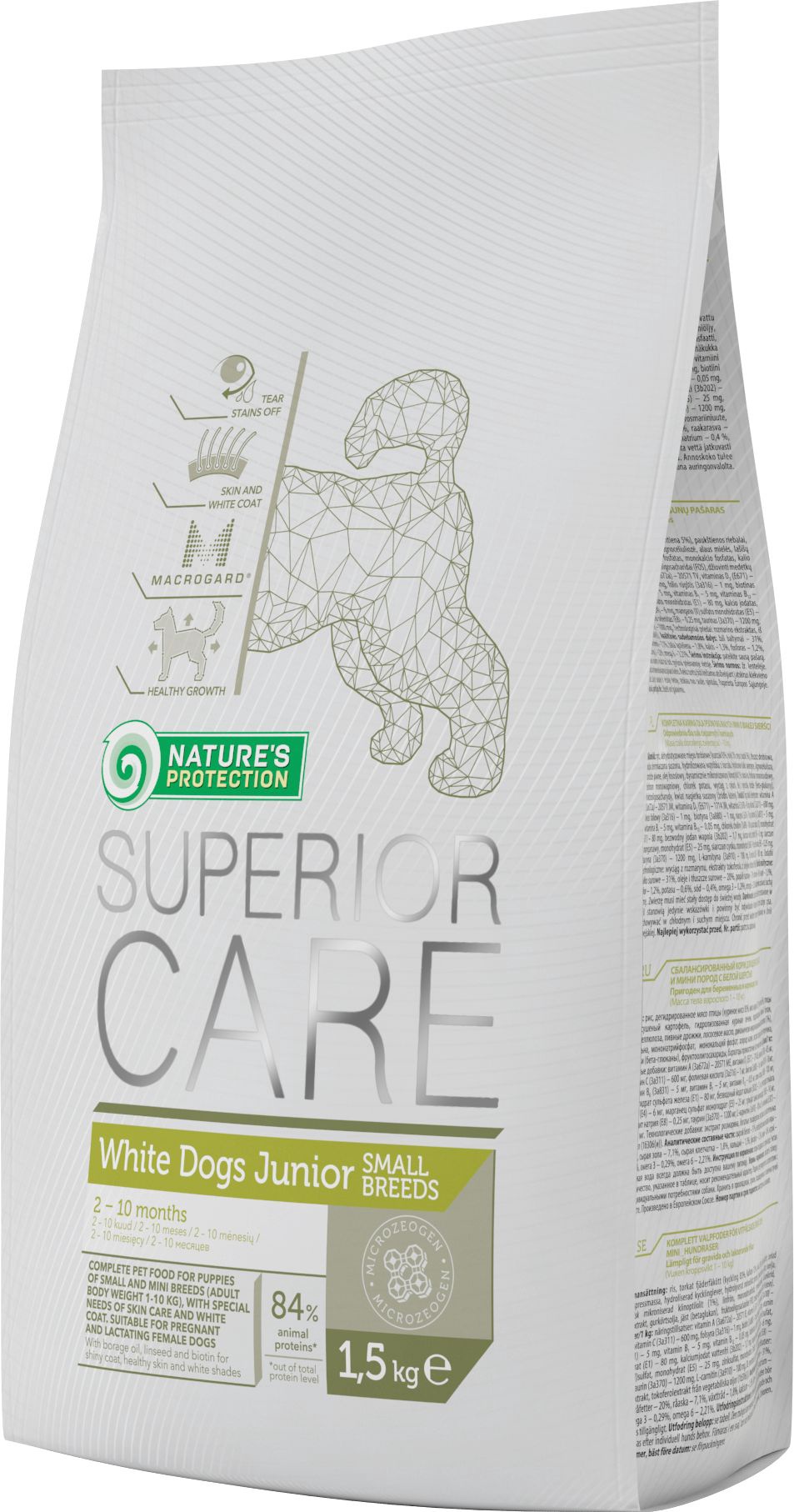 - Sudėtis Balta žuvis 42% (džiovinta ir smulkiai malta), džiovintų bulvių minkštimas, saldžiosios bulvės, žirniai, paukštienos riebalai, krilių miltai (min. 4%), cukrinių runkelių minkštimas, lašišų aliejus, dinamiškai mikronizuotas klinoptilolitas (1%), sėmenys, fruktooligosacharidai. (FOS), jukos ekstraktas, žalioji arbata, džiovintos medetkos (liuteino šaltinis).