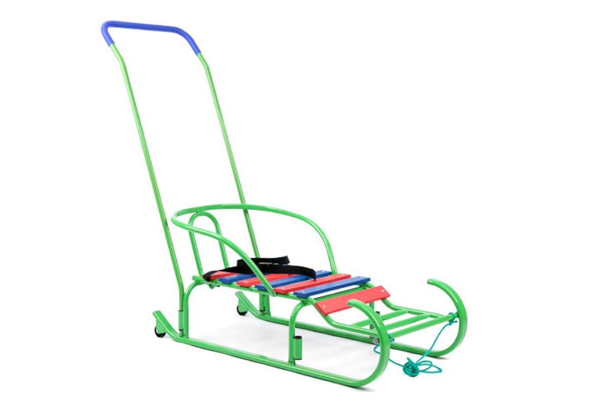 Санки Морозко 112 оснащены толкателем и ремешком с карабином для удобной и безопасной посадки ребенка. Служат для прогулок и катания с гор в зимний период. Изготовлены из стальной плоскоовальной трубы. На полозьях расположены колесики, которые позволяют везти санки по нескользкой поверхности. Также в основании санок есть веревка, благодаря которой удобно тянуть санки за собой во время прогулки.