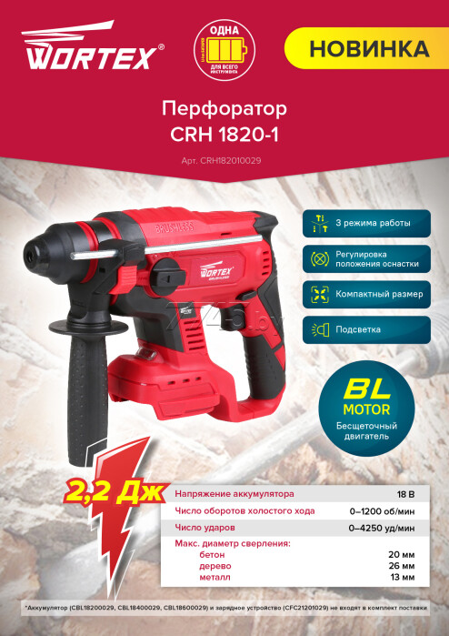 Перфоратор аккумуляторный WORTEX CRH 1820-1 ALL1 (1BCRH001A29) — имеет малый вес и компактные размеры, благодаря чему данный перфоратор становится незаменимым при работе в труднодоступных местах. Имеет два режима работы: сверление и сверление с ударом.