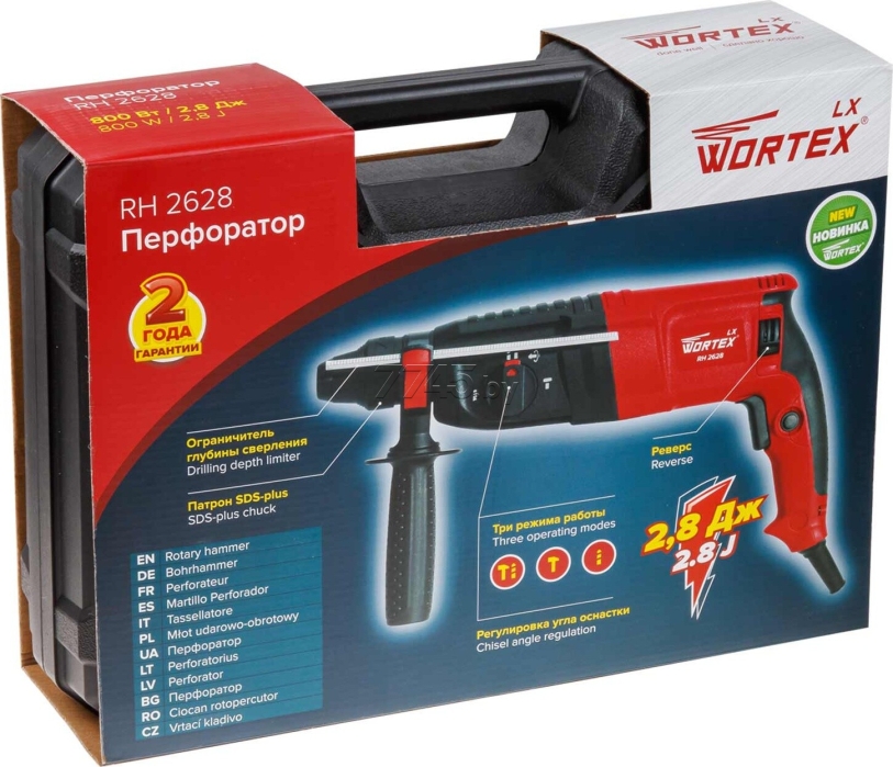 Перфоратор WORTEX LX RH 2628 (0329062) показывает высокую скорость при сверлении и высокую производительность при долблении благодаря двигателю в 800 Вт и энергии удара 2,8 Дж. 3 Вида работы - сверление, сверление с ударом, долбление. Также имеется функция регулировки угла оснастки, реверс. Быстрорегулируемая эргономичная рукоятка легко настраивается в любом нужном положении. Патрон SDS+.