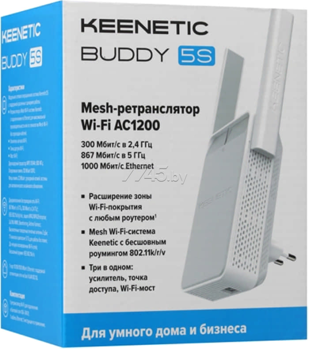 Усилитель сигнала Wi-Fi KEENETIC Buddy 5S – двухдиапазонный Mesh-ретранслятор сигнала Wi-Fi AC1200 с портом Gigabit Ethernet. Buddy может расширить зону покрытия Wi-Fi любого роутера в многокомнатной квартире, загородном доме или небольшом офисе — как усилитель, точка доступа или даже Wi-Fi-мост. Полная функциональность Buddy раскрывается, если подключить его в Wi-Fi-систему Keenetic по технологии Mesh Wi-Fi без прокладки кабелей или по Ethernet для максимальной производительности. Объединенные в Mesh Wi-Fi-систему устройства Keenetic образуют сеть с бесшовным роумингом по стандартам 802.11k/r/v и централизованным управлением с основного интернет-центра, через мобильное приложение или облачный сервис.