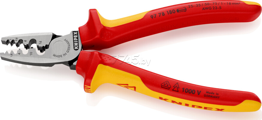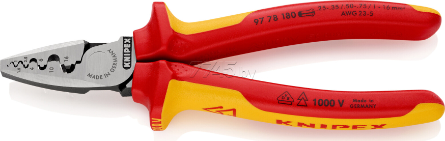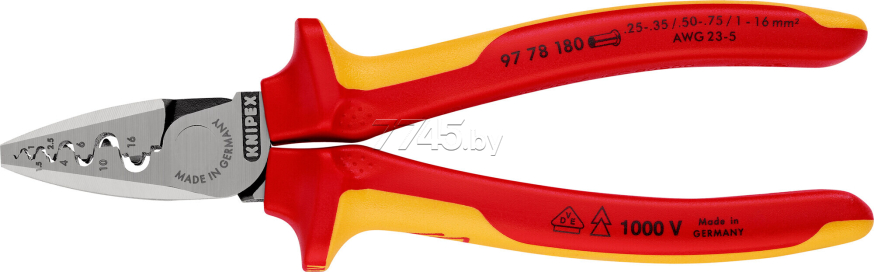 Кримпер для опрессовки гильз KNIPEX диэлектрический (97 78 180) обеспечивает легкий процесс опрессовки благодаря максимальной передаче усилия. Легкая и компактная конструкция. предназначен для опрессовки контактных гильз (по стандарту DIN 46 228 часть 1 + 4) в диапазоне сечений от 0,25 до 16 мм². Oпрессовка в маркированных полукруглых профилях для надежного соединения гильзы и проводника. 9 глубоких профилей с коническими гранями.