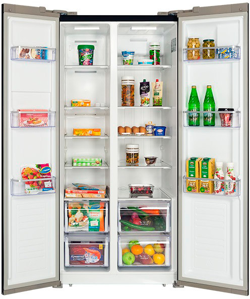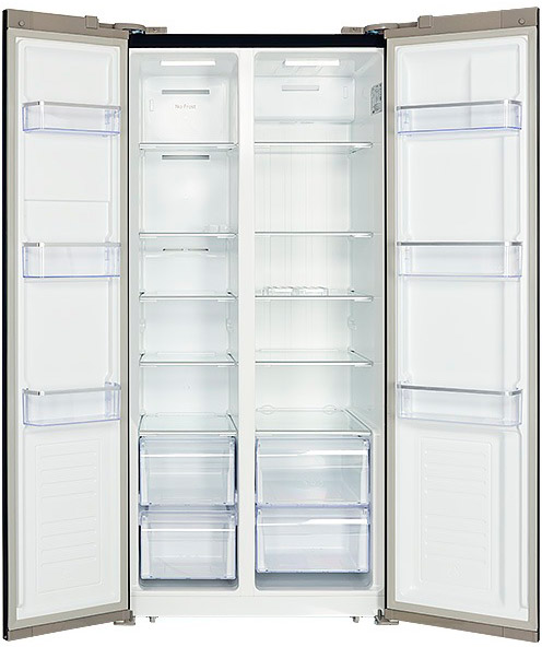 Отдельно стоящий, двухкамерный, компоновка Side-by-side, No Frost, класс энергопотребления A+, объем холодильной камеры 271 л, объем морозильной камеры 176 л, электронное управление, встроенные ручки, дисплей.