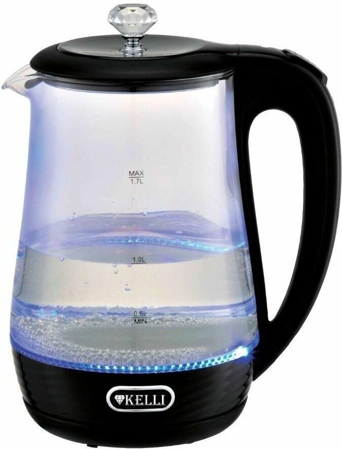 Электрический чайник, мощность 2200 Вт, объем 1.7 л, материал корпуса пластик/стекло, нагревательный элемент закрытая спираль, дополнительные функции: индикация включения, подсветка воды, подставка с вращением на 360°.
