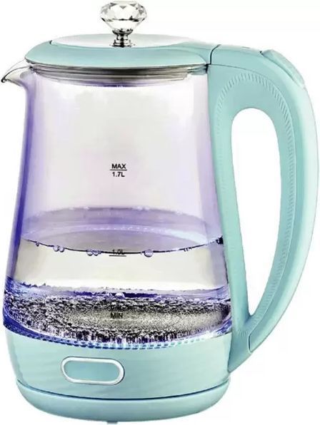 Электрический чайник, мощность 2200 Вт, объем 1.7 л, материал корпуса пластик/стекло, нагревательный элемент закрытая спираль, дополнительные функции: индикация включения, подсветка воды, подставка с вращением на 360°.
