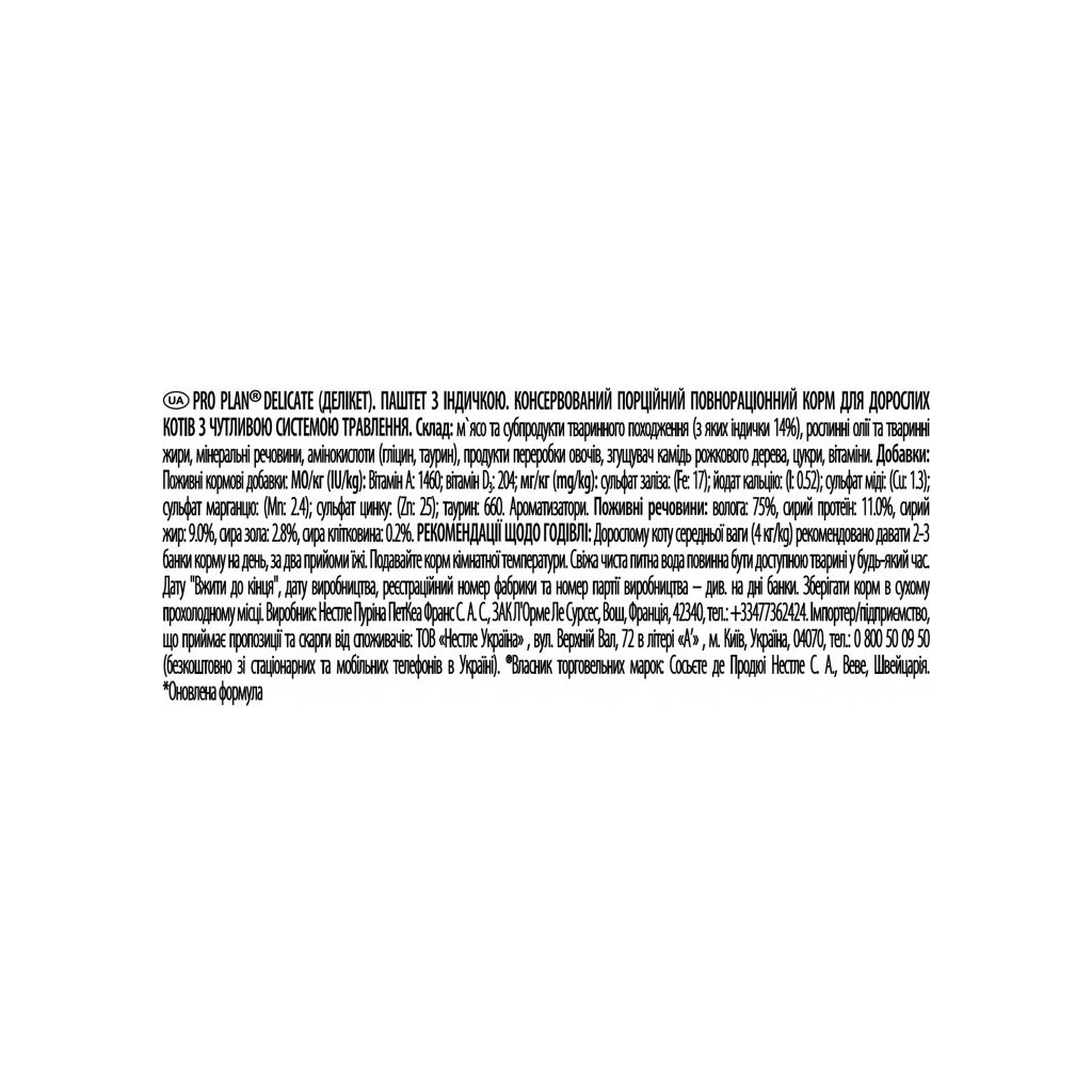 Pro Plan Delicate (ПРО ПЛАН ДЕЛІКЕТ). Паштет з індичкою. Консервований порційний повнораціонний корм для дорослих котів з чутливою системою травлення.