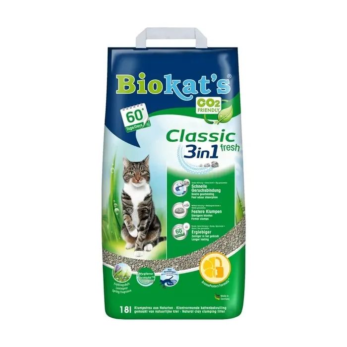 Запах Biokat's Classic fresh із весняним ароматом вирізняється своєю формулою захисту — Aroma Protect Formula. Ця формула надійно ізолює неприємні запахи та вивільняє запашний весняний аромат. Чим вирізняється формула гігієни Hygiene Formula 3in1? Hygiene Formula 3in1 складається з гранул трьох різних розмірів. У великих гранулах особливо багато великих пор: ці пори вбирають рідину, як губка, і поглинають запахи.