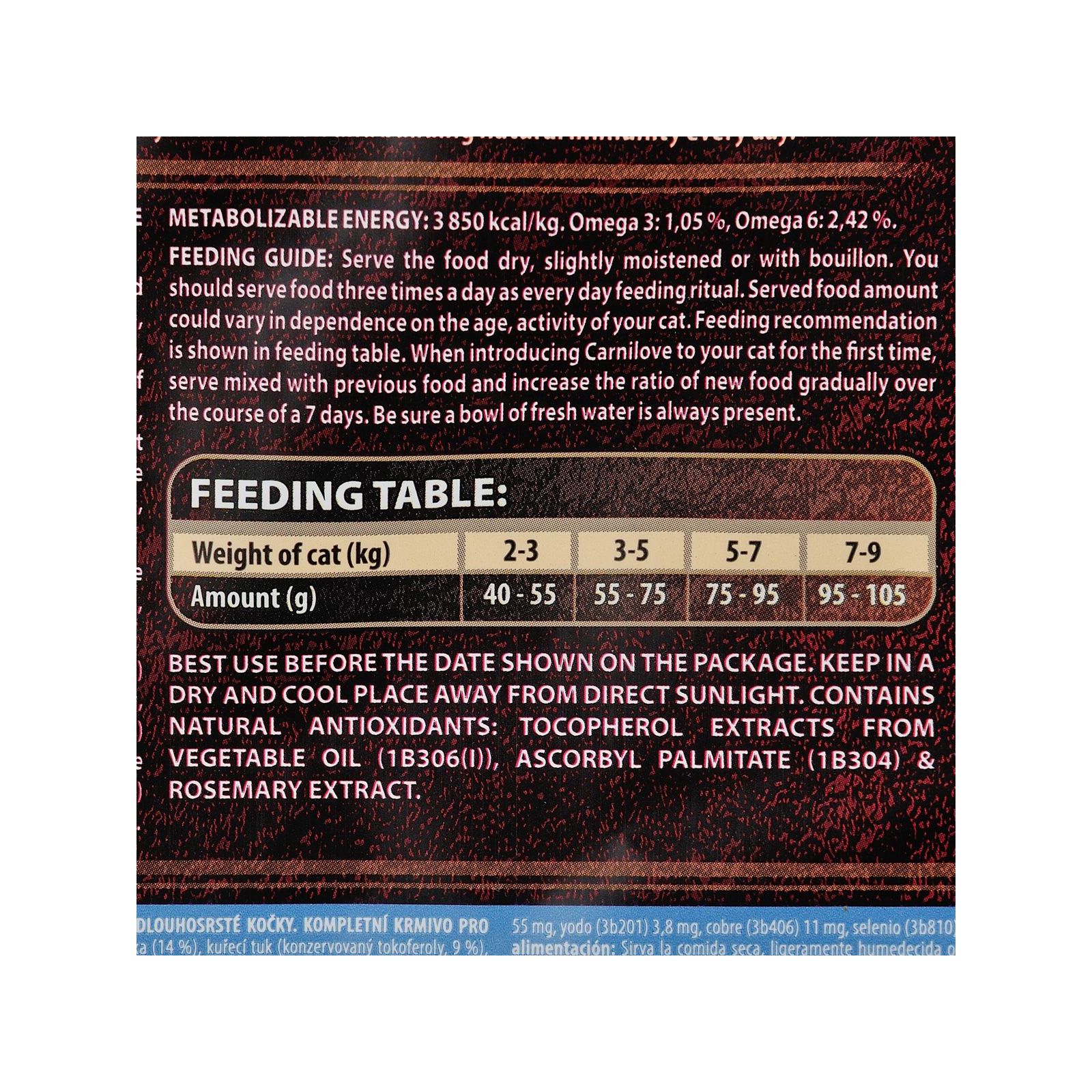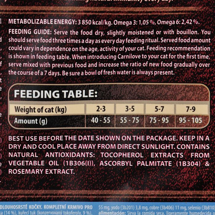 Рекомендації щодо годування: давати корм сухим або змочивши у теплій воді або бульйоні. Годувати кота необхідно тричі на день. Кількість корму може бути змінена залежно від віку та активності вашого кота. Коли годуєте кормом Carnilove вперше, змішуйте невелику кількість із попереднім кормом, і збільшуйте співвідношення поступово упродовж тижня. Завжди перевіряйте наявність свіжої води.