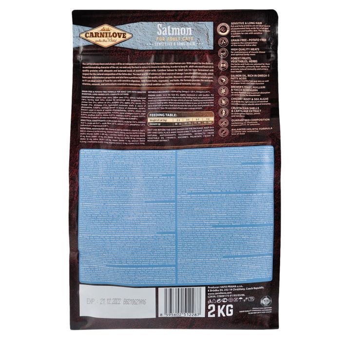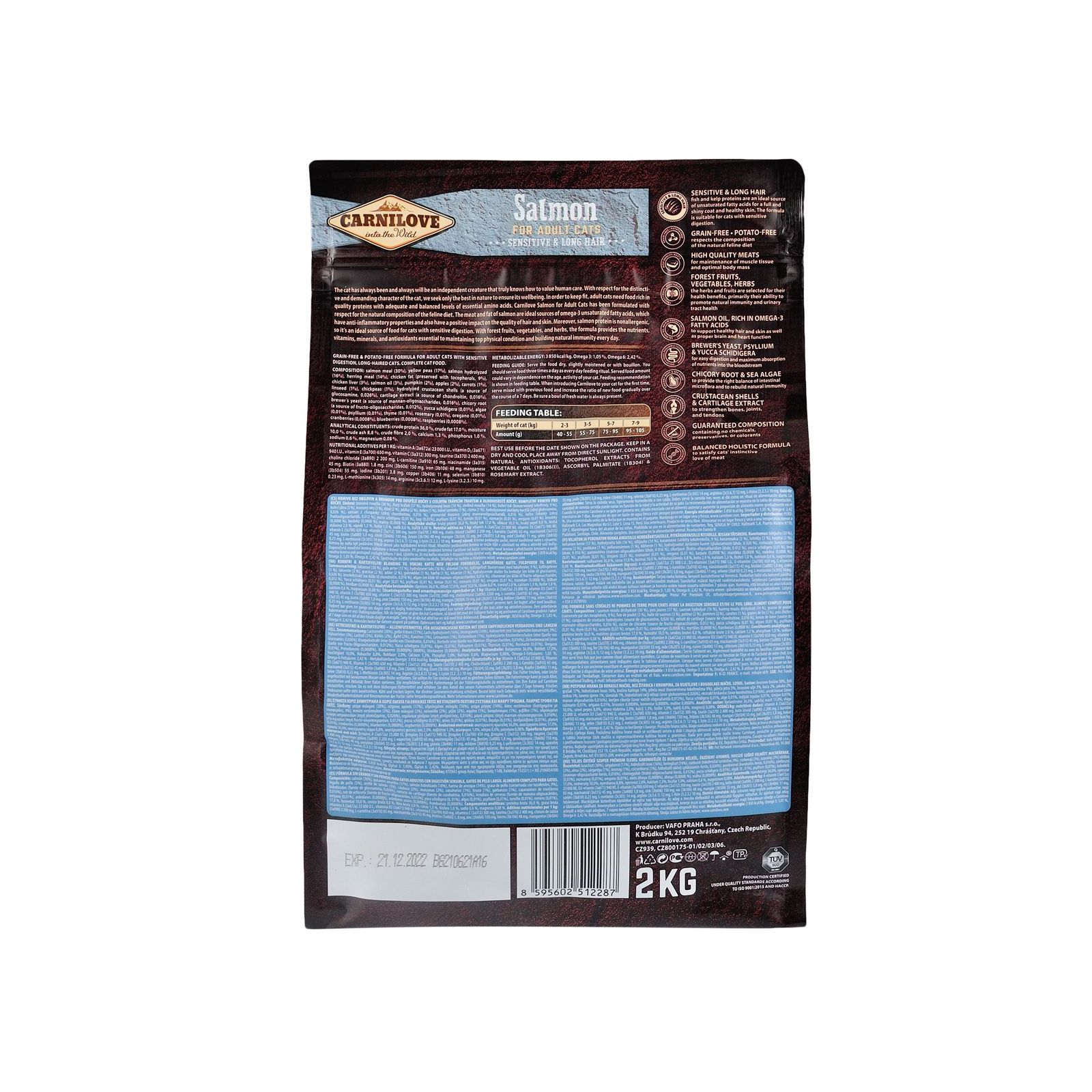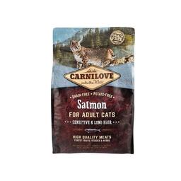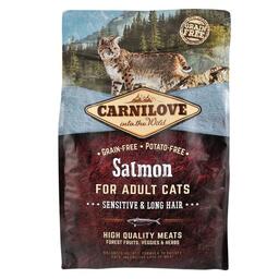 Carnilove Salmon Sensitive&Long Hair — повнораціонний беззерновий сухий корм класу холістик із м'ясом лосося для дорослих кішок із чутливим травленням і довгошерстих кішок.