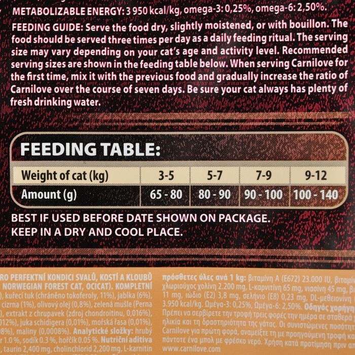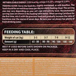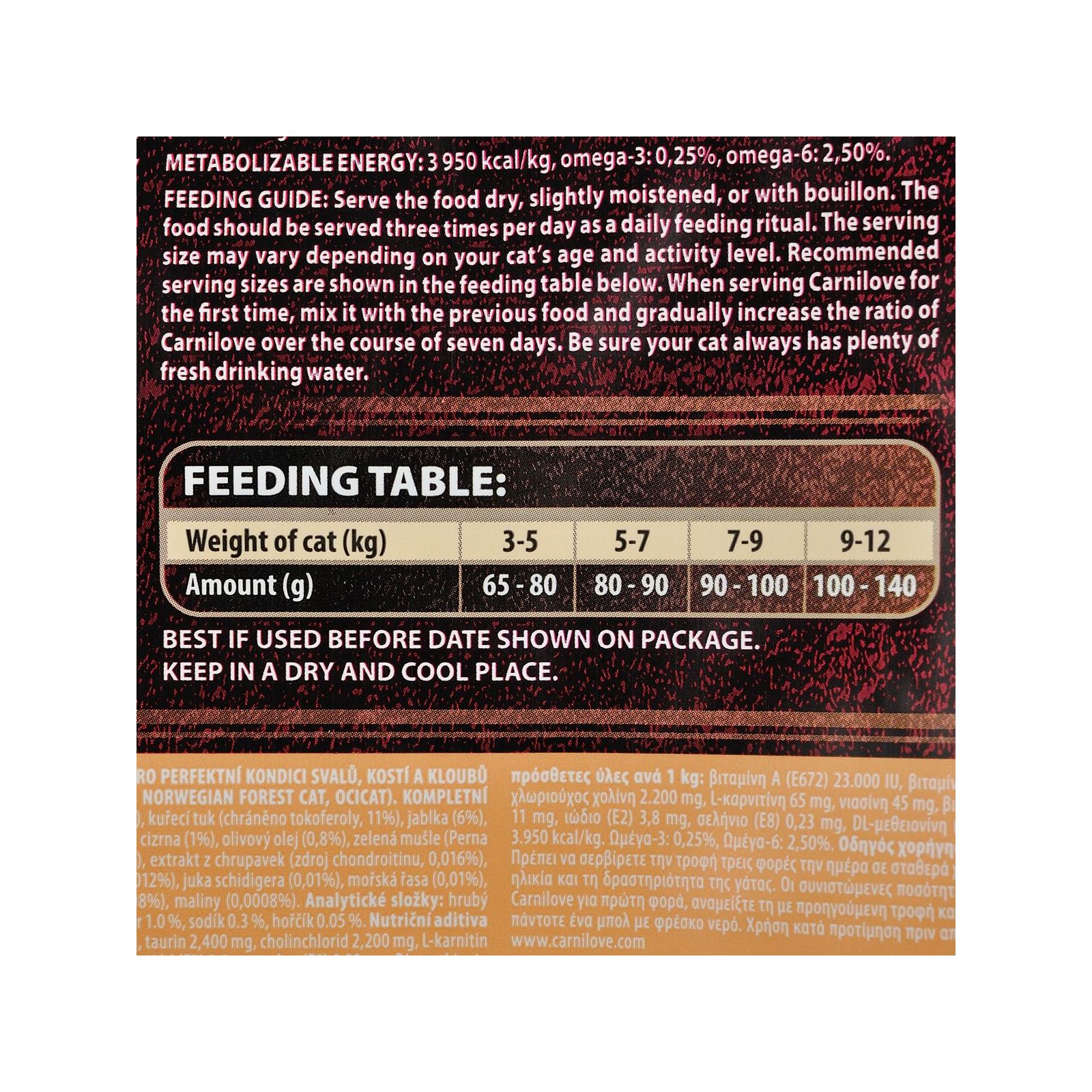 Рекомендації щодо годування: давати корм сухим або змочивши у теплій воді або бульйоні. Годувати кота необхідно тричі на день. Кількість корму може бути змінена залежно від віку та активності вашого кота. Коли годуєте кормом Carnilove вперше, змішуйте невелику кількість із попереднім кормом, і збільшуйте співвідношення поступово упродовж тижня. Завжди перевіряйте наявність свіжої води.
