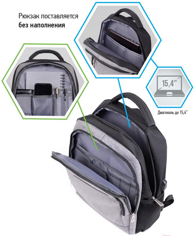 • Внутреннее наполнение отделение для ноутбука/планшета, карман-органайзер, порт для зарядки (USB-разъем)