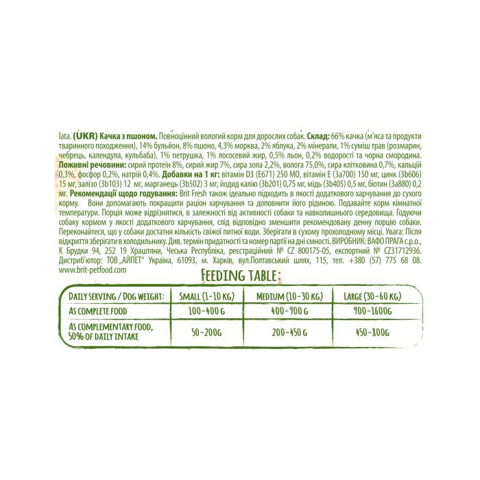 Brit Fresh Duck & Millet може використовуватися як повноцінне харчування, так і в якості додаткового харчування при щоденному споживанні.