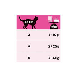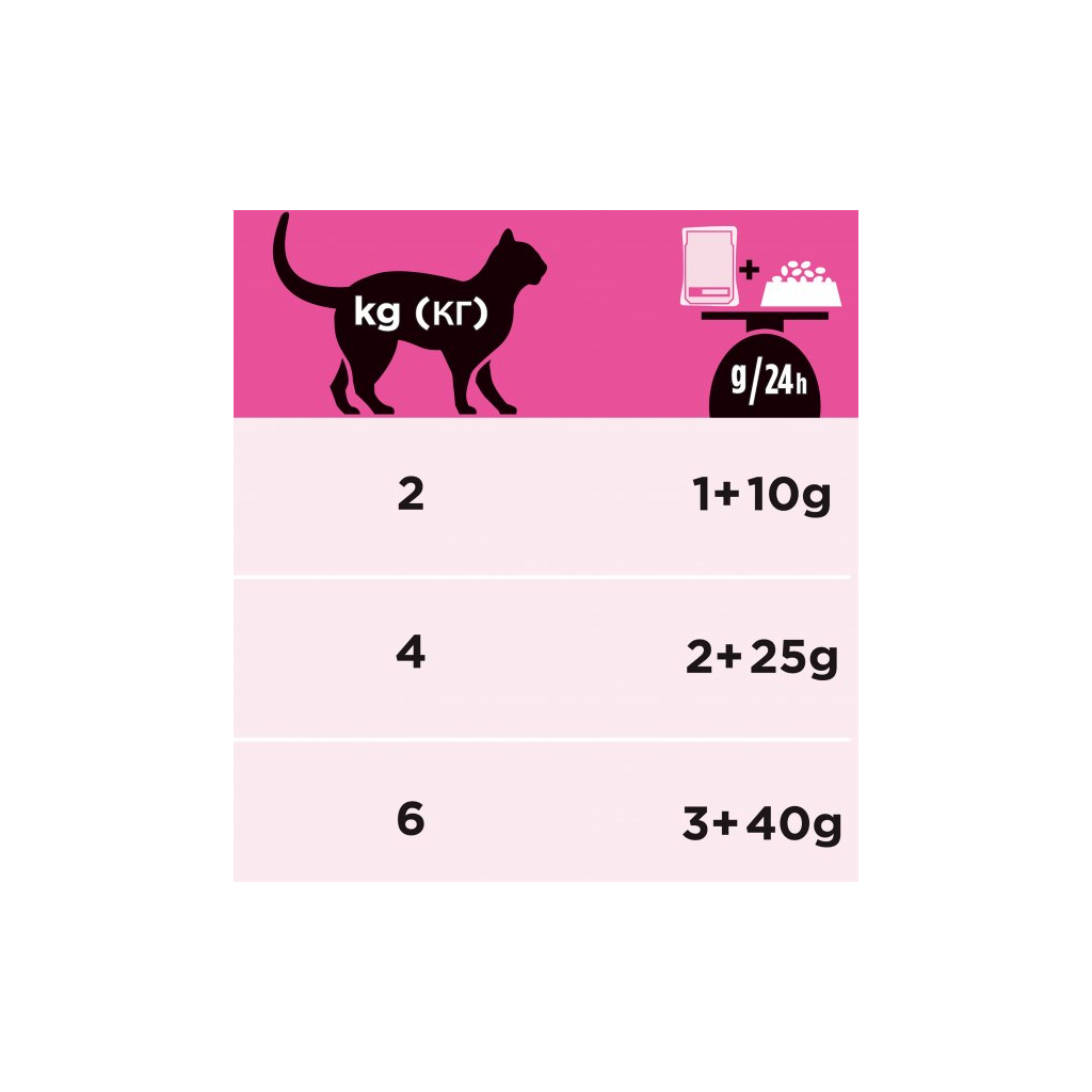 Рекомендації щодо годування (на добу): см. таблицю. Перший стовпчик: вага тварини (кг/kg), другий стовпчик: кількість консервованого корму (пакетики, шт.), Третій стовпчик: кількість корму (пакетики, шт. + Сухий корм, г/g). У третьому стовпці таблиці вказані рекомендації зі змішаного годування консервованим і сухим кормом типу NF Renal Function (Ренал Фанкшн) . Перед початком або продовженням терміну використання корму рекомендована консультація ветеринарного лікаря. Рекомендований період застосування: до 6 місяців. Слідкуйте за тим, щоб у вашої тварини завжди була свіжа вода. 1 пакетик консервованого корму = 25 г/g сухого корму NF Renal Function (Ренал Фанкшн) для кішок. Зберігати в сухому прохолодному місці. Дату "Вжити до", дату виробництва, реєстраційний номер фабрики та номер партії: див. внизу паковання.