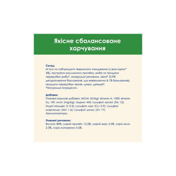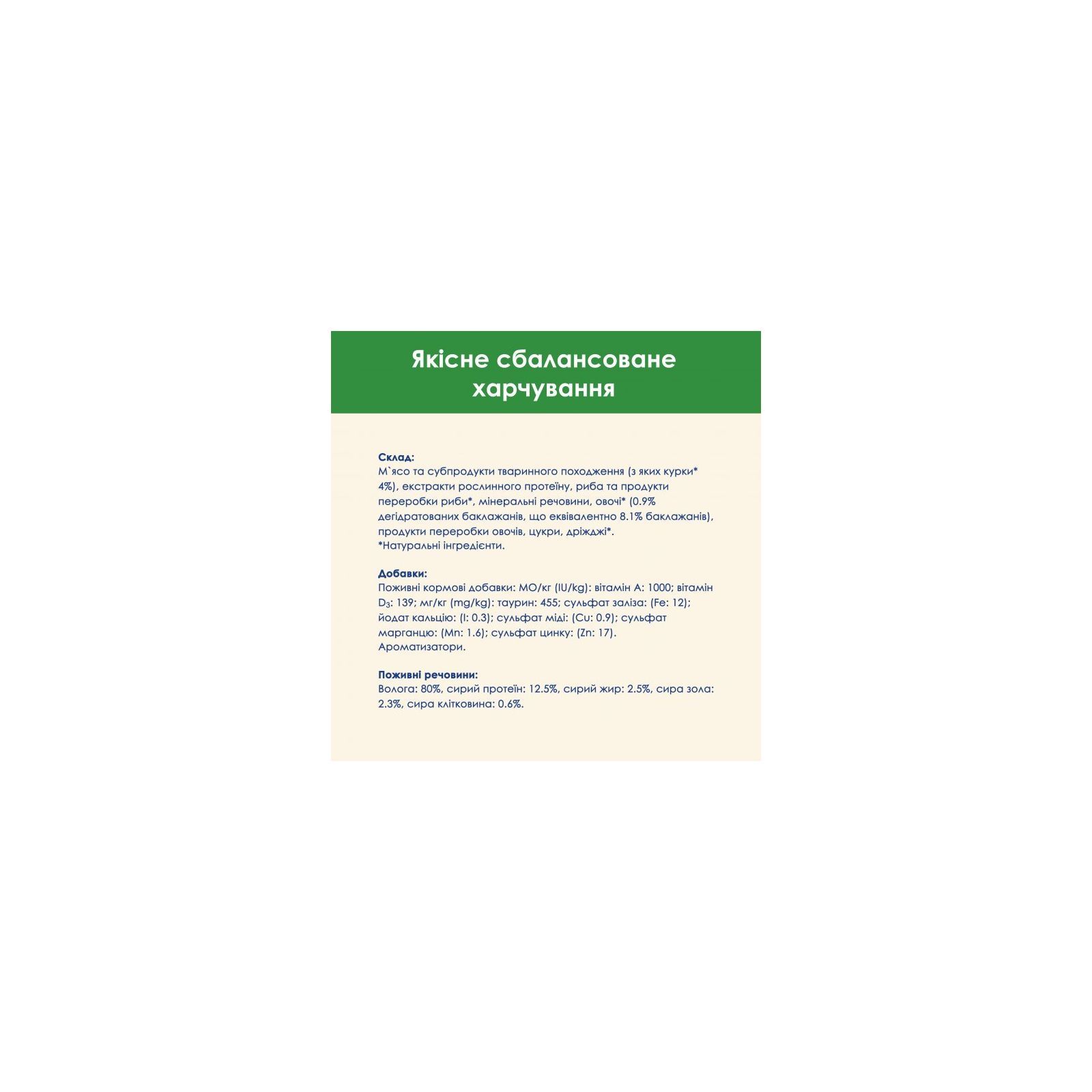 Склад: м'ясо та субпродукти тваринного походження (з яких курки* 4%), екстракти рослинного протеїну, риба та продукти перероблення риби*, мінеральні речовини, овочі* (0.9% дегідратованих баклажанів, що еквівалентно 8.1% баклажанів), продукти перероблення овочів, цукру, дріжджі*.