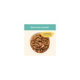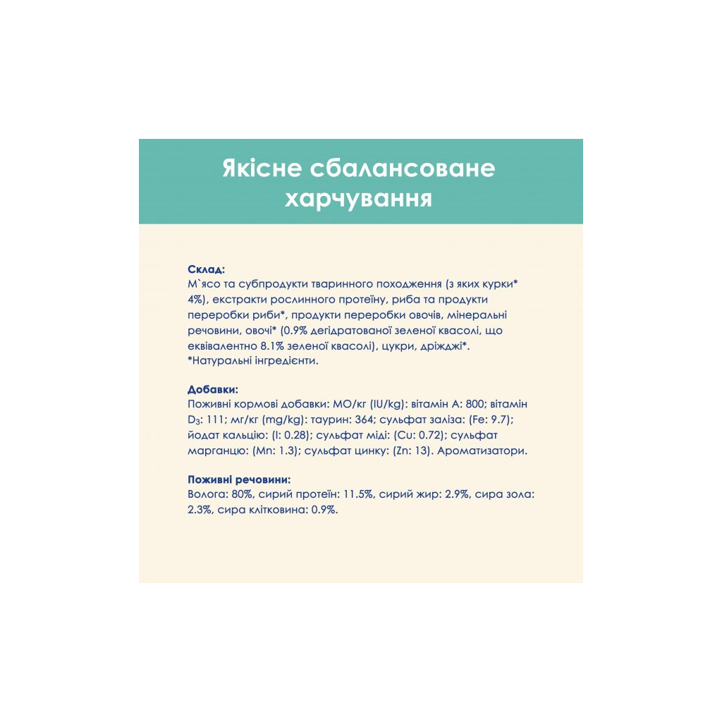 Склад: М'ясо та субпродукти тваринного походження (з яких курки* 4%), екстракти рослинного протеїну, риба та продукти перероблення риби*, продукти перероблення овочів, мінеральні речовини, овочі* (0.9% дегідратованої зеленої квасолі, що еквівалентно 8.1% зеленої квасолі), цукор, дріжджі*.