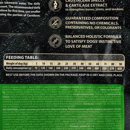 Склад : борошно з м'яса качки (30%), борошно з м'яса фазана (22%), жовтий горох (20%), курячий жир (насичений токоферол, 8%), філе качки (5%), куряча печінка (3%), яблука (3%), тапіоковий крохмаль (3%), лососева олія (2%), морква (1%), насіння льону (1%), нут (1%), гідролізовані мушлі ракоподібних (джерело глюкозаміну, 0,026%), хрящовий екстракт (джерело хондроїтину, 16%), пивні дріжджі (джерело мананоолігосахаридів, 0,015%), корінь цикорію (джерело фруктоолігосахаридів, 0,01%), екстракт юки Шидигера (0,01%), водорості (0,01%), подорожник (0,01%), чебрець (0,01%), розмарин (0,01%), орегано (0,01%), журавлина (0,0008%), лохина (0,0008%), малина (0,0008%).