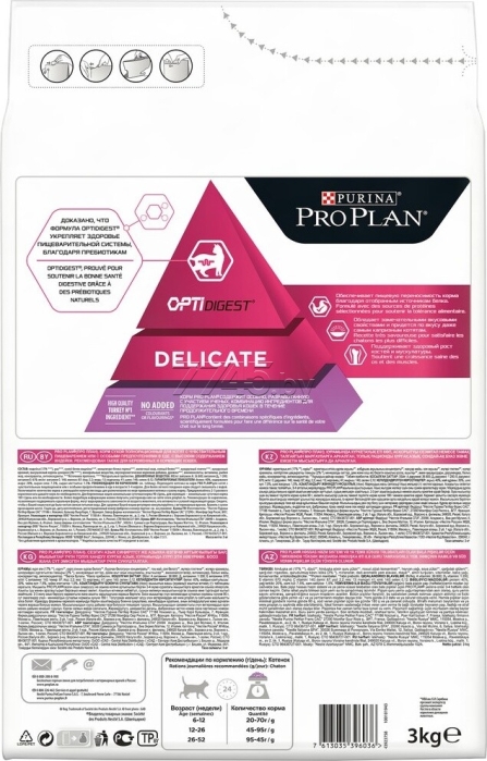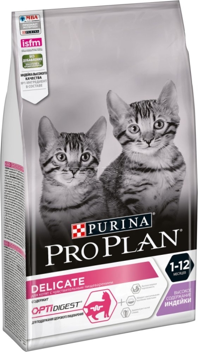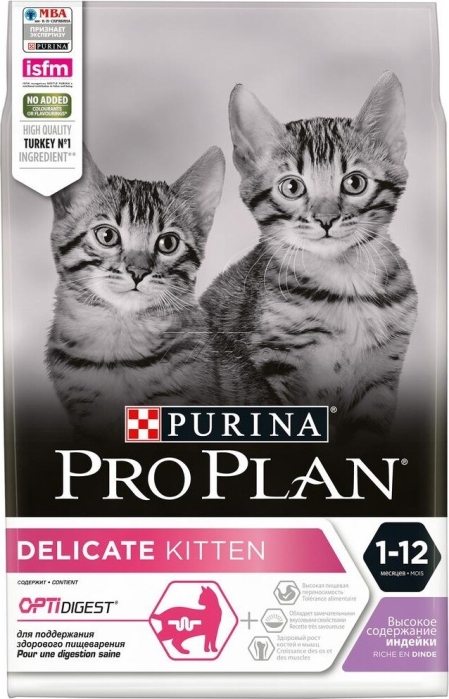 Сухой корм для котят PURINA PRO PLAN Delicate Kitten индейка 3 кг (7613035396036) ‒ полнорационный корм для котят с чувствительным пищеварением или с особыми предпочтениями в еде, с высоким содержанием индейки. Легко усваивается, обладает замечательными вкусовыми свойствами и придется по вкусу даже самым капризным котятам. Также подходит для беременных и кормящих кошек.